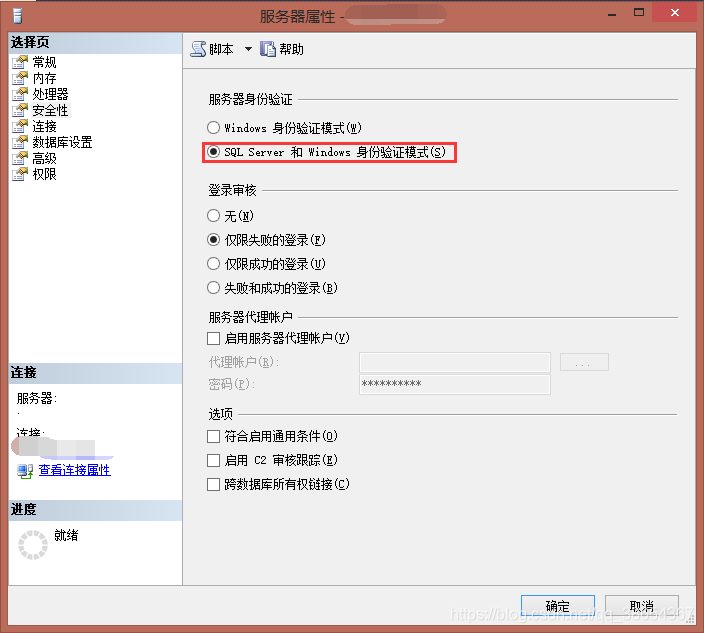 STEP 2. 选择“安全性”,选中SQL SERVER和Windows身份验证模式
