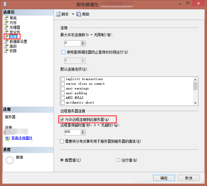 STEP 3. 再选择“连接”,勾选“允许远程连接此服务器”,然后点击“确定”按钮。