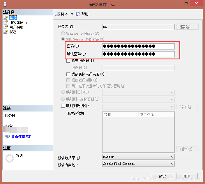 STEP 5. 在“常规”中,改好你自己的密码,这是你sa登录的密码。