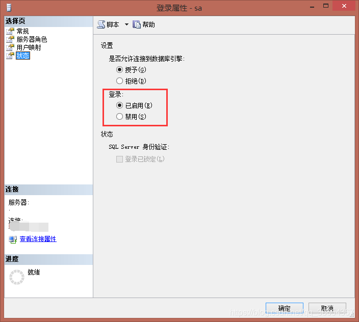 STEP 6. 在“状态”中,启用sa登录,点击“确定”按钮
