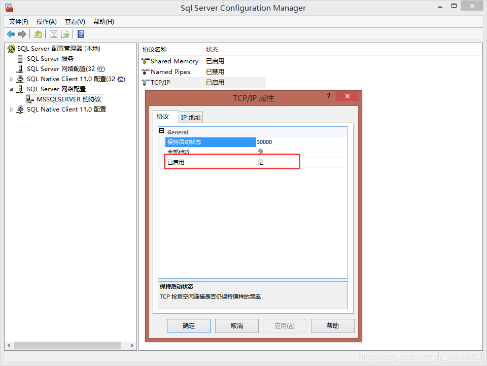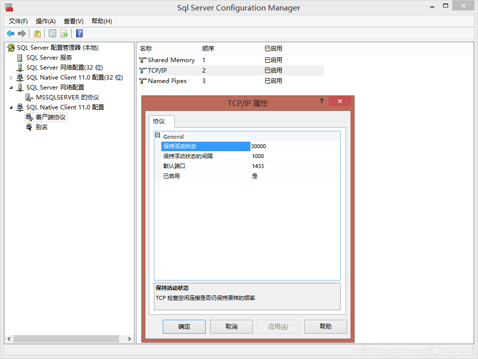 STEP 11. 在Client里也确保TCP/IP是启用的,默认的端口都是1433,可以自己修改,非默认端口需要在连接字符串里显式指明。